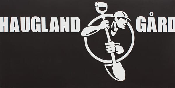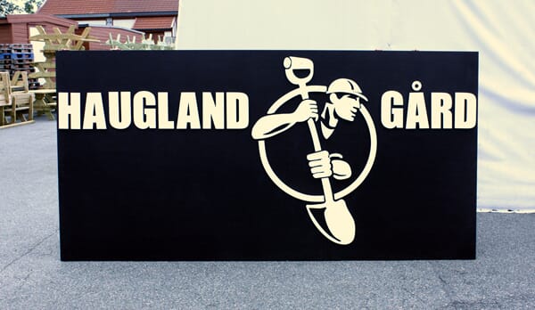 Skiltet på bildet er laget med stål bokstaver som er montert på en malt treplate og måler ca. 3 meter x 1,5 meter.