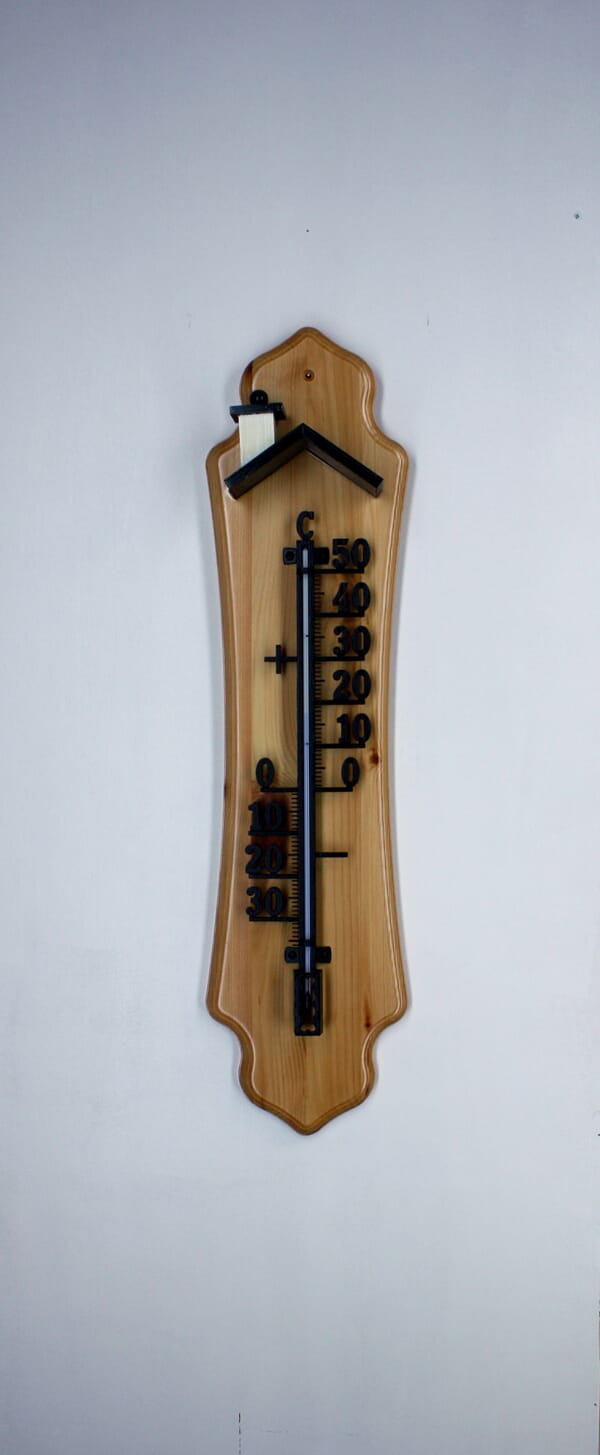 Utetermometer malt i flere forskjellige farger med tak og pipe.